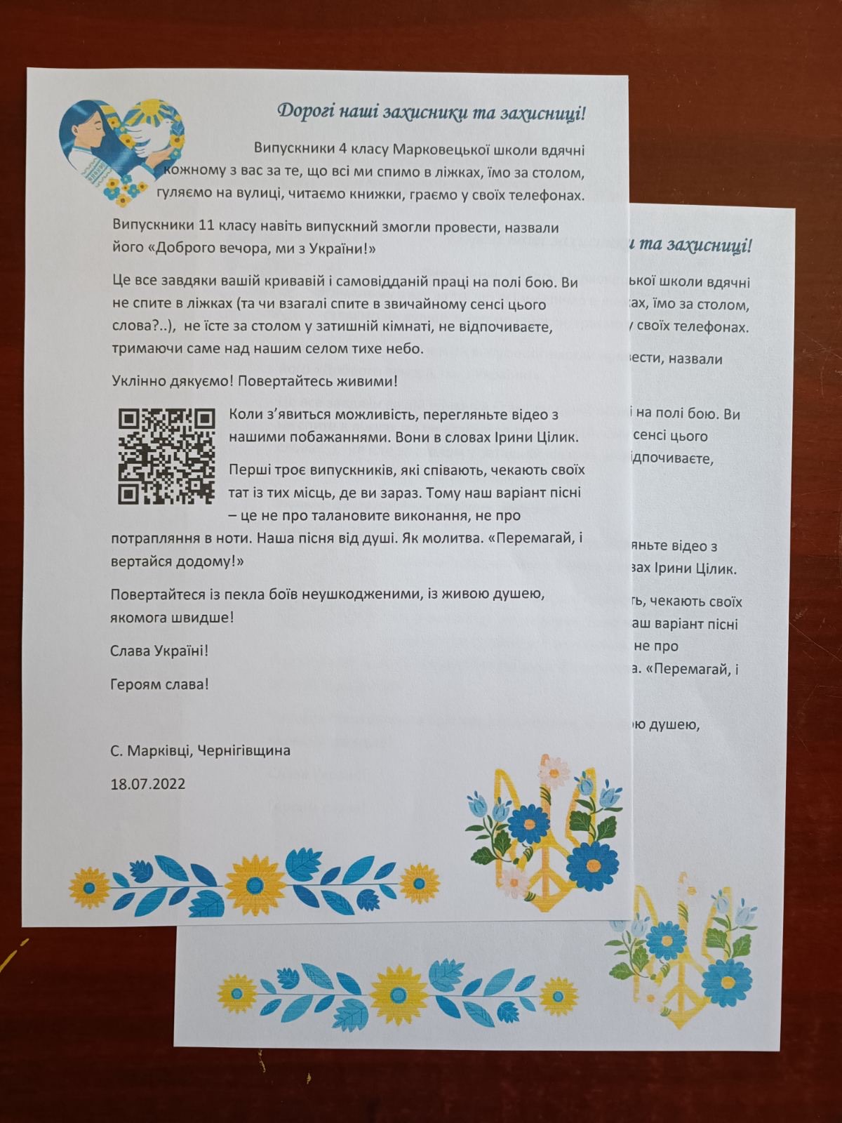 Випускники 4 класу та учні Марковецької школи, під керівництвом Шостак Олени Вікторівни, підготували подарунки та харчі, нашим захисникам на передову.