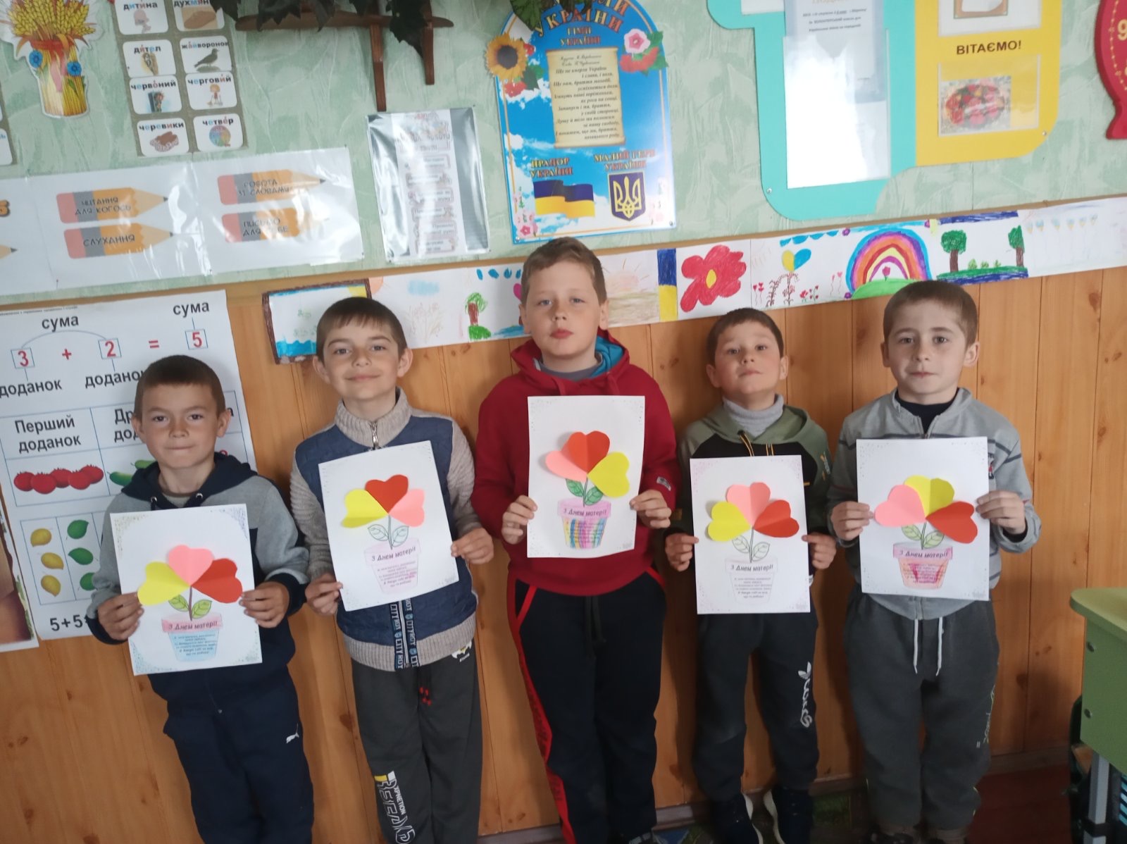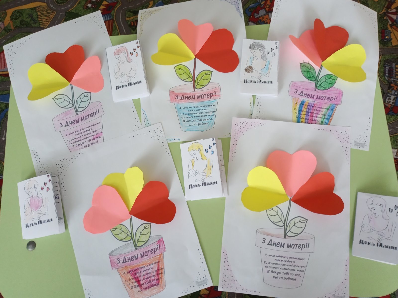 До Дня матері здобувачі освіти другого та третього класів підготувалися заздалегідь:виготовили власноруч вітальні листівки та мініатюрні книжечки для своїх матусь.Також учні познайомились з історією виникнення свята.