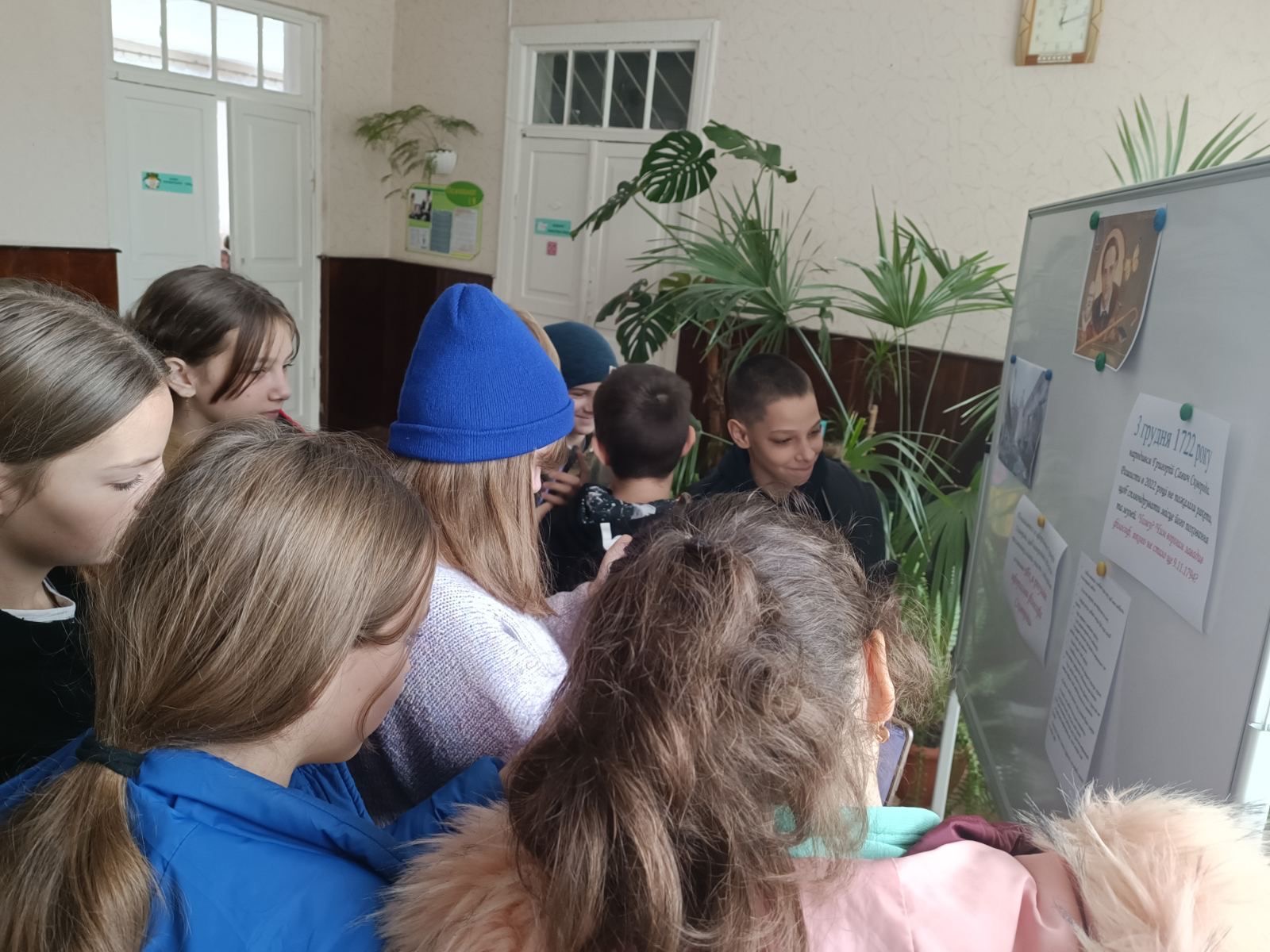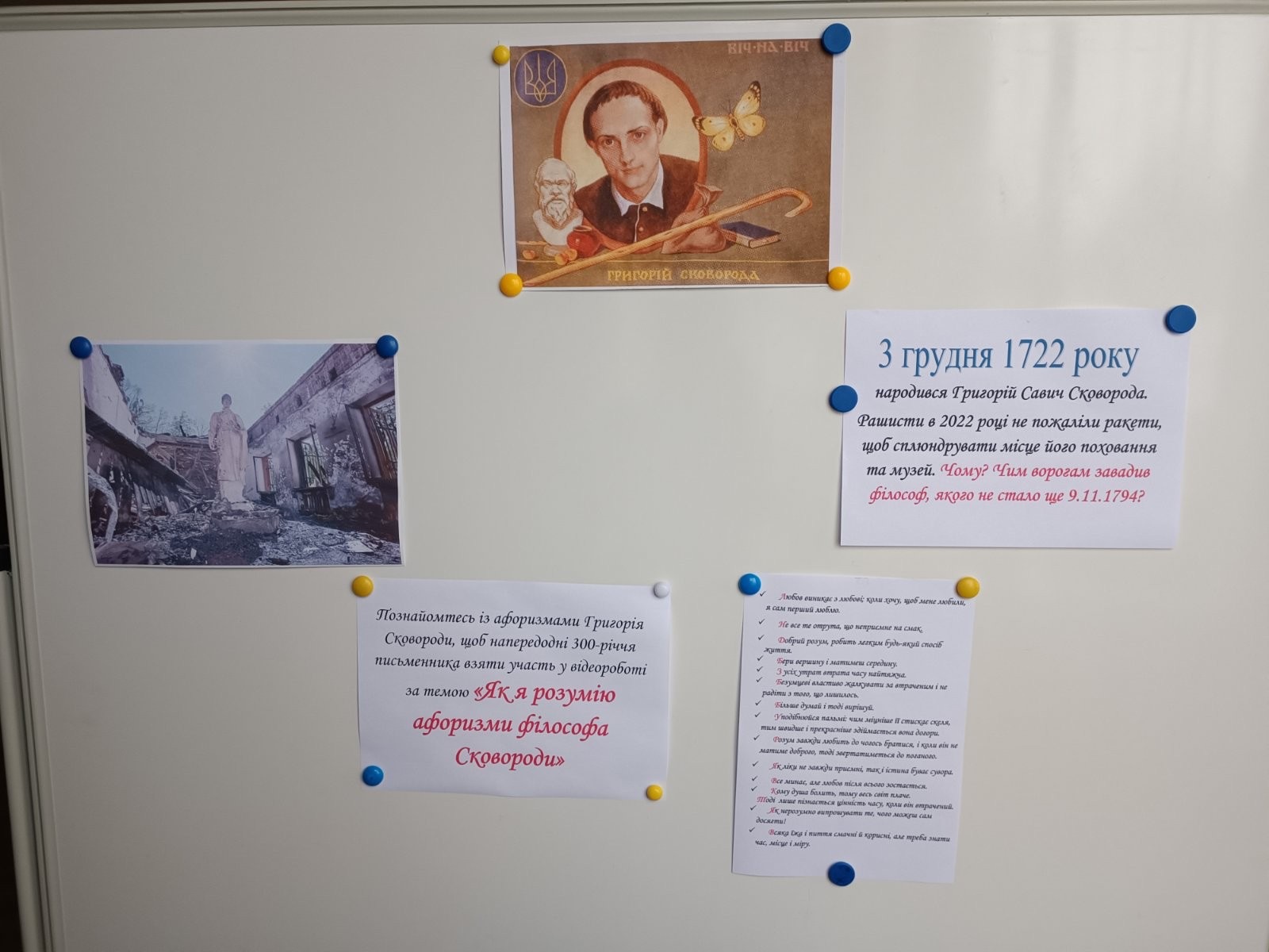Переглядаючи презентацію "НЕ тіло, а душа є людиною"(до 300-річчя Г.Сковороди), старшокласники намагались розібратись, наскільки актуальним у воєнному сьогоденні є вислів: "Коли не зможу нічим любій Вітчизні прислужитись, в усякому разі з усієї сили намагатимусь ніколи нічому не шкодити".