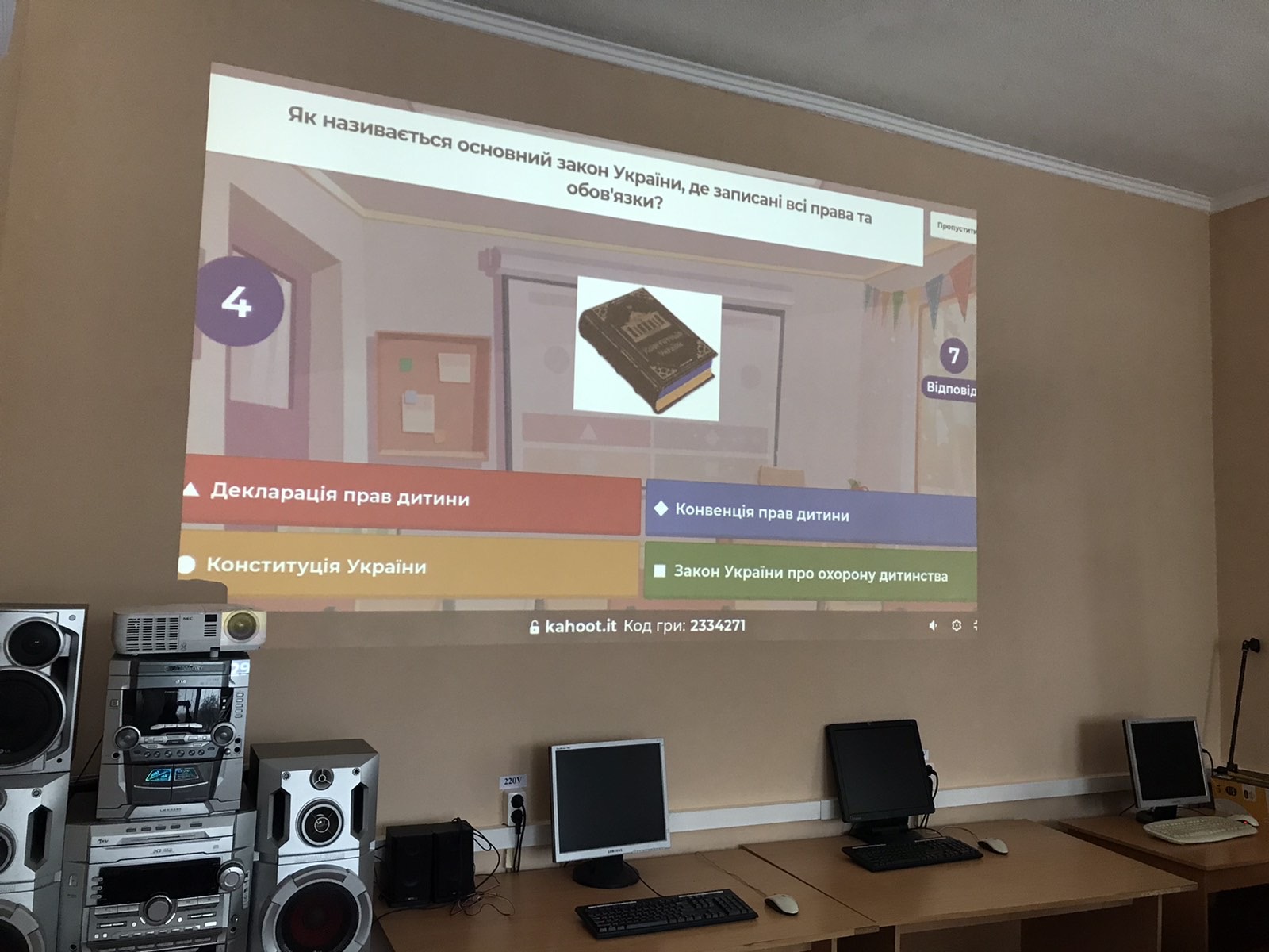 Для участі у грі учням необхідний телефон, щоб відповідати на питання, а вчителю комп'ютер, щоб переглядати онлайн трансляцію із запитаннями. Вчитель правознавства Берегун В. А. використав проектор, для зручності перегляду.